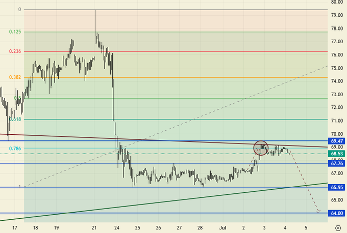 Продажа: сейчас (68,66). Стоп: 69.70. Цель: 64.00.