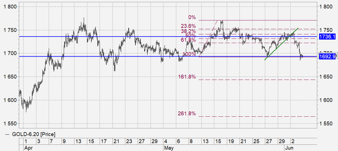 На торгах в Азии цены на золото вернулись выше уровня 1700. Однако, говорить сейчас о том, что рынок снова попробует пройти выше 1820 мы не можем. При подъеме к 1730 можно продавать. Отметим, что рынок акций оторвался от реальности. Есть риск прохода выше 3200 по SP500, что может привести к движению на 4000. Если именно это и будет происходить, то золото пойдет вниз.