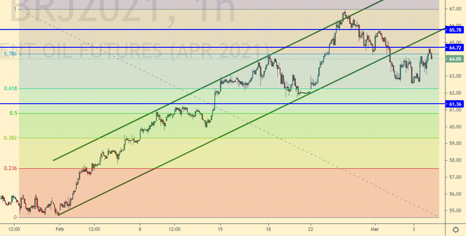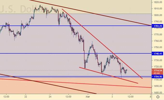 Рынок нарисовал нам клин вниз, который может закончиться пробоем вверх. Если это произойдет, то можно будет купить. До заседания ФРС осталось десять торговых дней (17-го марта), рынок может начать отыгрывать ожидания. Не исключено, что Пауэллу и компании (членам комитета), удастся заболтать рынки и увести народ от мысли о скорой инфляции в США. В этом случае золото может вновь пойти вверх.