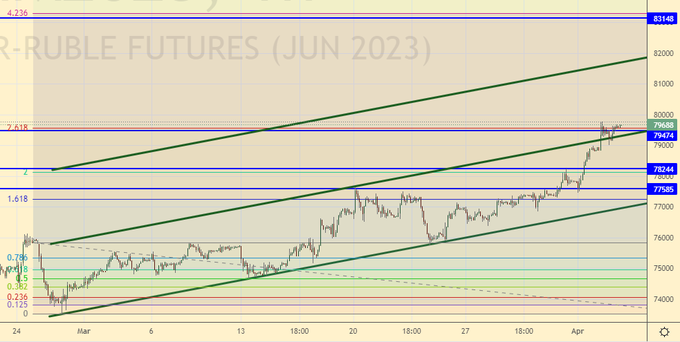 Читая наши прогнозы, вы могли заработать на фьючерсе на доллар/рубль взяв ход вверх от 75900 до 79500.