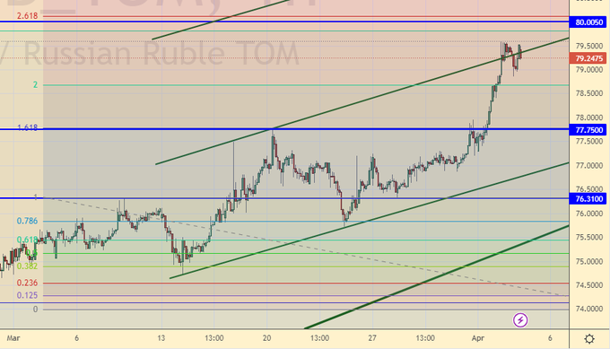 Если и сегодня не будет попыток пройти вниз, и мы продолжим уходить вверх, например, на 50 копеек, то уровень 80.00 приобретет сильную значимость. В случае его взятия быками откроется отметка 84.00. Пока нет сомнений в том, что конечная цель текущей фазы ослабления рубля – это уровень 88.00.