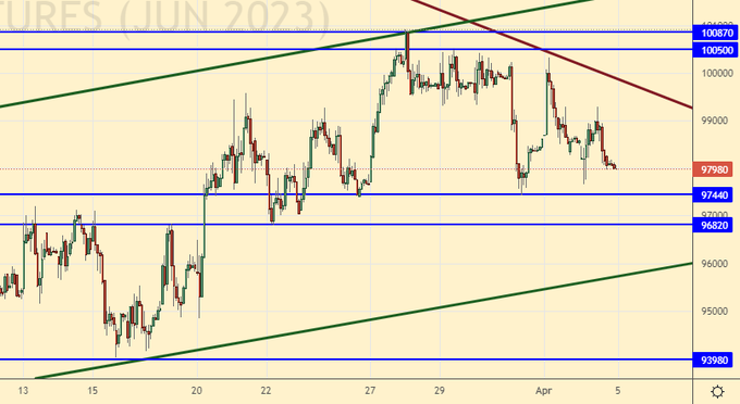 Продажа: нет. Кто в позиции от 100000, перенесите стоп на 100600. Цель: 80000.
