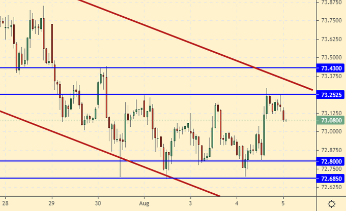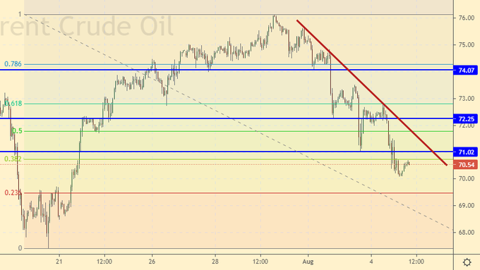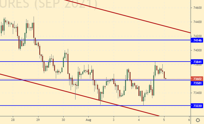 Не забываем о регулируемом росте добычи на 400 тыс. баррелей в сутки каждый месяц от ОПЕК, а также о страхах по пандемии. Картинка получается вполне себе медвежья. Но покупку от 70.00 отработаем.