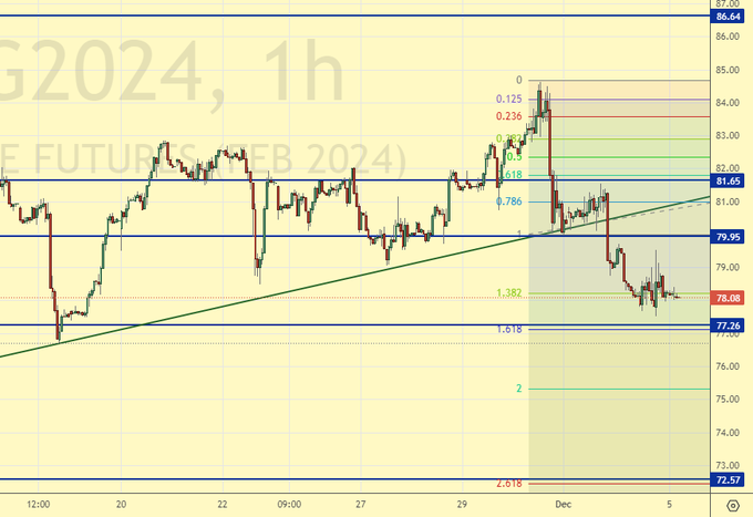 Видим, что волновая теория предполагает падение к 72.50, а на 75.00 возможна лишь остановка. Более глубоко находится 65.00, но движение к этой отметке возможно лишь в случае появления каких-то новых фундаментальных вводных. Если верить тому, что пишут, то мы расти должны. Один только отчет ОПЕК выходящий каждый месяц чего стоит. Там вечный дефицит и вечный рост спроса.