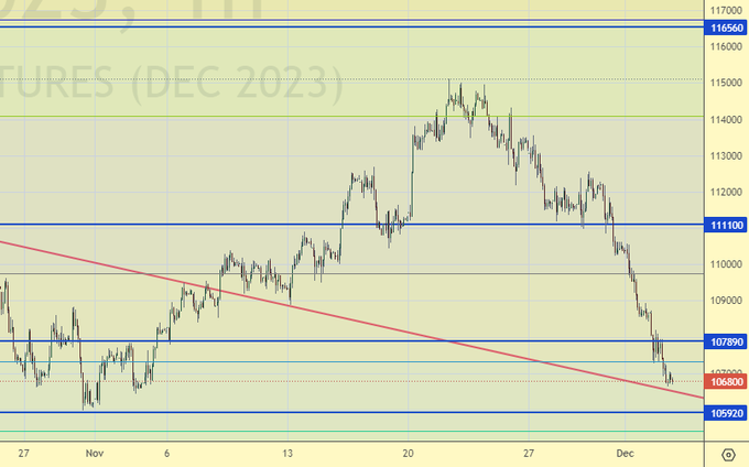 Продажа: нет. Кто в позиции от 113800, перенесите стоп на 107300. Цель: 103000.