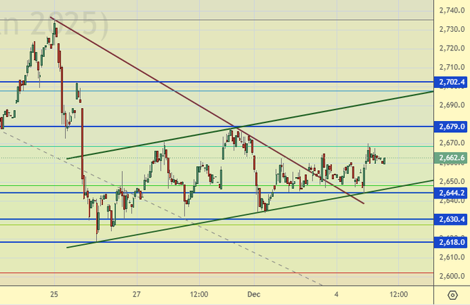 Ничего нового. Продолжаем оставаться выше 2630. Быкам надо разгонять рынок, иначе мы рискуем получить здесь разворот вниз с последующим поиском себя на 2400 (2120). Пока техническая картинка вверх не разрушилась имеет смысл держать лонги.