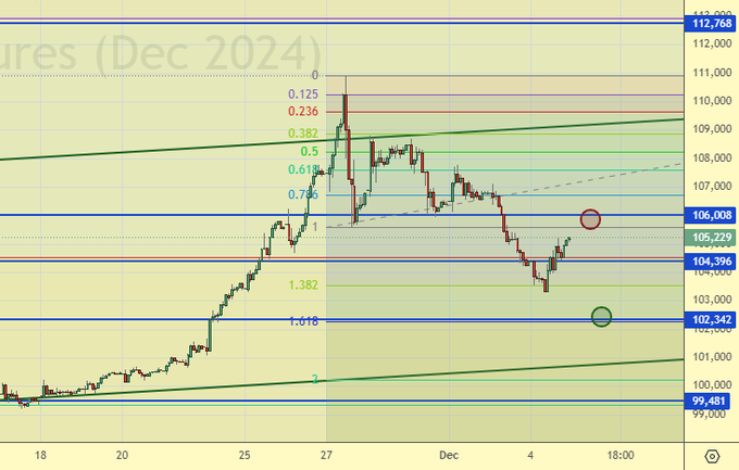 Продажа: нет. Кто в позиции от 106300, держите стоп на 106400. Цель: 102500.