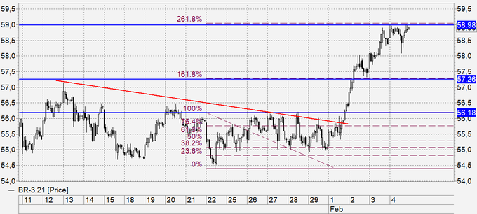 Рынок нефти пока не желает останавливаться. Все лимиты разумного движения вверх мы исчерпали, но тем и славен рынок, что он непредсказуем. В случае продолжения рост будем оставаться вне рынка, так как каких-либо интересных уровней для покупок нет, а для продаж нам нужен сигнал разворота вниз. Отметим, что если рынок сможет закрепиться выше 60.00, это может привести к приходу на рынок неискушенных инвесторов, которые еще на пять – семь долларов будут способны поднять цены.