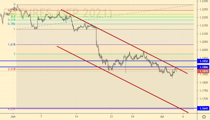 Пока картинка за долларом: цены внутри падающего канала. Видим, что утром понедельника у части игроков есть желание поставить на падение евро.