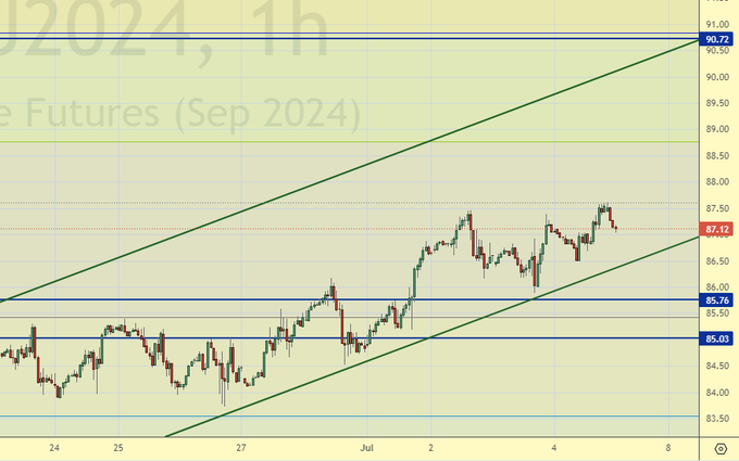 Покупка: нет. Кто в позиции от 85.39, перенесите стоп на 85.20. Цель: 99.90.