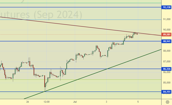 «Рост выше 89000 вызовет ход к 90000», – писали мы вчера, сегодня мы это получили. Видим тут хлипенькие попытки что-то продать, что говорит нам о том, что сил у продавцов пока нет. Власти нашли у себя какую-то инфляцию, будут лечить её препаратами: антибиотиками и свечами. Она, эта болезнь, не даст рублю сильно укрепиться. И здесь вряд ли поможет рост ставки, причем рост ставки хоть куда. Разве только до 50%, но этого хватит на три месяца укрепления. Пока вне рынка.