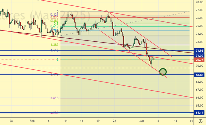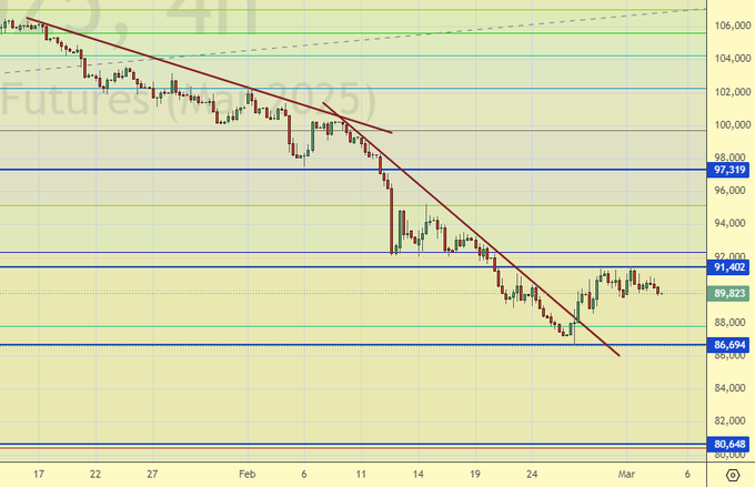 «Поклонники рубля имеют шанс на то, чтобы снова попытаться пройти ниже 87000», — эта фраза вчерашнего дня остается актуальной и сегодня. Если Штаты действительно сливаются и закрывают за собой дверь, оставляя щель только для нужных им плюшек, то в целом для Москвы это неплохо, так как гегемон будет заниматься своими домашними проблемами. На моменте падение цен на нефть не должно позволить пробиваться к 80000, но рынки иногда ведут себя так, как никто не ждет. От 80000 стоит покупать более агрессивно, чем с текущих уровней.