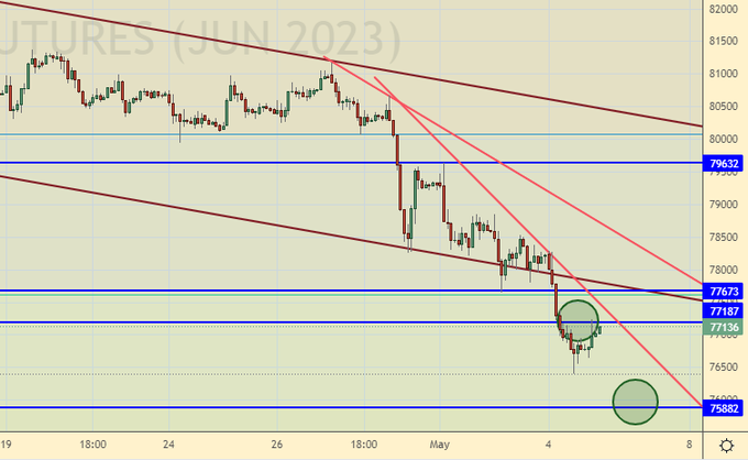 Как и ожидалось, спот нашел поддержку в районе 78.00. Были попытки быстро пройти ниже, но они успехом не увенчались. Стоит удерживать лонги в расчете на рост. На фьючерсе покупки также интересны. Причем, от 76000 они наиболее актуальны.