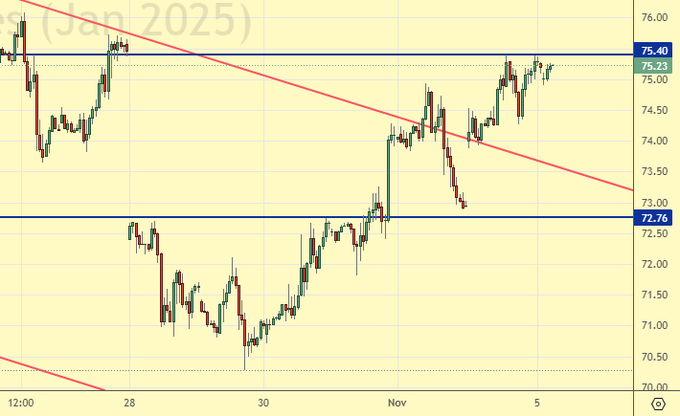 Быки проявили упорство и в понедельник пытались пробиться выше 75.40. Пока это не удалось. Но, если все-таки котировки поднимутся выше данного уровня, то это можно будет считать хорошим бычьим сигналом, после возникновения которого рынок будет хотеть уровень 80.00.
