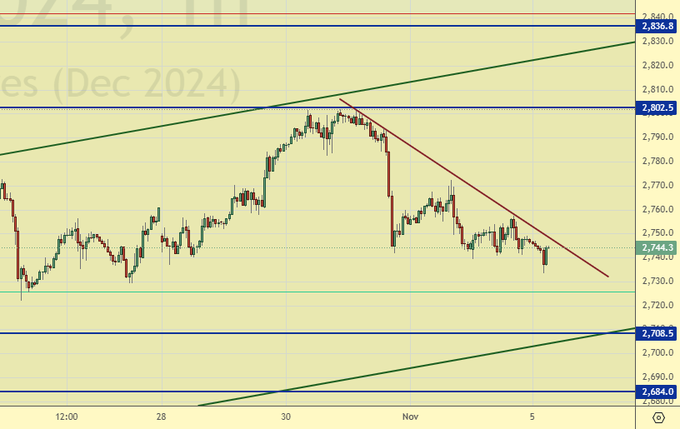 Сегодня вторник (это для тех, кто после праздника), а заседание ФРС в четверг. Не исключен легкий подъем, но в целом рынок будет ждать заседание ФРС. Новых идей нет, только старые. Рост к 2838 можно использовать для продаж.