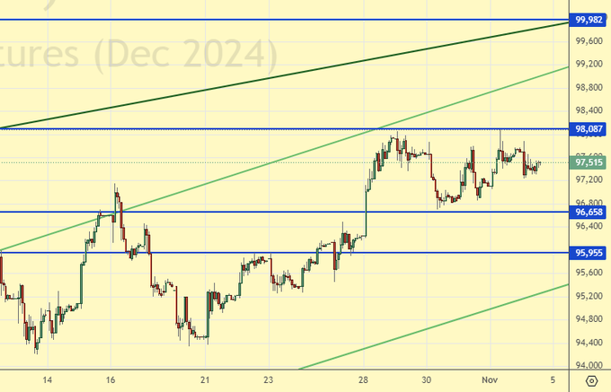 И снова мы задаемся вопросом: дадут ли нам 96000 до посещения 99500. Шансы еще есть, мы пока не закрепились выше 98100.