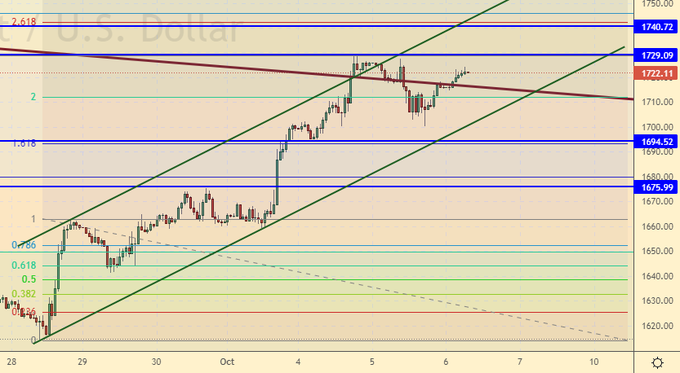 Видим по золоту борьбу в важном районе 1730. В случае прорыва выше под угрозой будет 1750, если возьмут и его, то быки сломают медвежий тренд. Пока мы под 1730 можно искать возможности для входа в шорт.