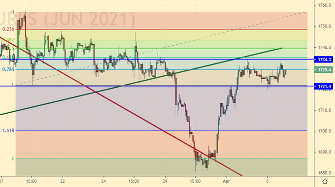 После резкого отскока вверх от 1680 на рынке неопределенность. Быкам надо проходить выше 1750 для того, чтобы на рынок вернулись быки. Поэтому, пока будем ставить на падение. Отметим, что в случае хороших экономических данных из США за первый квартал золото перейдет к падению. А пока этих данных нет, нам придется ждать еще довольно долго, практически до конца апреля, рынок будет пребывать в подвешенном состоянии.