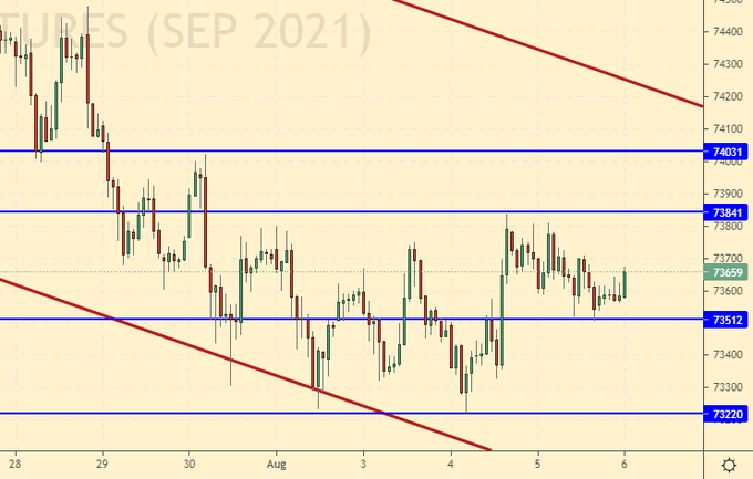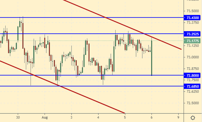 Видим попытки разогнать импульс вверх. Если мы пройдем выше 73.30, то можно нарастить покупки. Фундаментально рубль выглядит неплохо, поэтому его падение в текущих условиях будет ограничено общемировыми тенденциями.