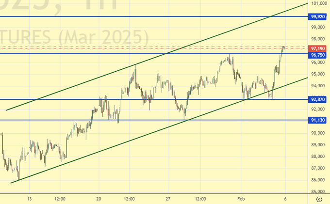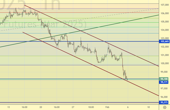 Проход ниже 98100 приведет к спуску к 95400. Если же мы удержимся на текущих уровнях, то должен последовать разворот к 102600. Судя по всему, правительство вместе с банками решило укрепить курс рубля. Зачем? Чтобы вынудить держателей долларов избавиться от них, после чего последует новая стадия роста. Причем, укрепиться в этой схеме мы можем и до каких-то неприличных уровней. 70.00, например. Банкам надо на чем-то показывать прибыль. Это же бизнес. А уже не на чем. Приходится крутить наперстки.