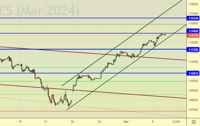 Пришли к максимумам, по фьючерсу показали даже новый «хай». Это бычий сигнал. Смущает только однонаправленность роста. Для того чтобы войти в позицию вверх было бы неплохо увидеть откат вниз долларов на 50.00. Можно покупать и сейчас, но надо отдавать себе отчет в том, что произойдет если рынок пойдет не в вашу сторону.
