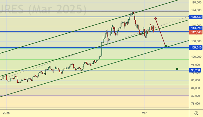 Продажа: при подходе к 120000. Стоп: 122000. Цель: 105000. Или сейчас 112840. Стоп: 116200. Цель: 93000. Считайте риски.