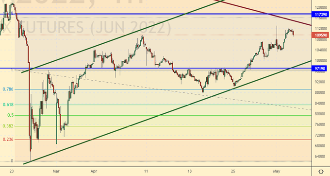 Нельзя исключать касания 117000, но дальнейший рост вряд ли будет возможен. Слишком много внешнего негатива. Будут ли выплачиваться хоть какие-то дивиденды крупными компаниями не ясно, так как многим придется нести повышенные расходы на поддержание инфрастурктуры. Неопределенная ситуация на Украине также не добавляет оптимизма на фондовом рынке.