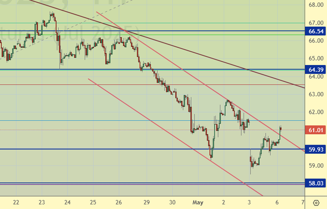 Продажа: сейчас (61.01). Стоп: 63.20. Цель: 54.70. Кто в позиции от 64.37, перенесите стоп на 63.20. Цель: 54.70.