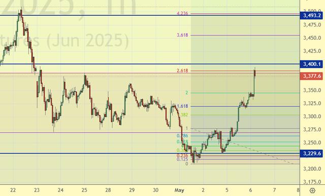 Нарисовали вверх импульс и выполнили цель по нему. Это может привести к тому, что мы продолжим уходить вверх. Нам придется отработать возможность дальнейшего роста после заседания ФРС 7-го мая. То есть завтра. Попробуем купить на откате.