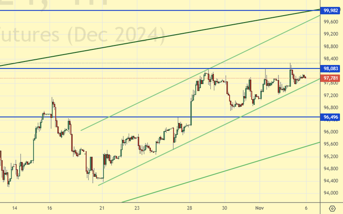 Ничего нового. Мы продолжаем задаваться вопросом: дадут ли нам 96000 до посещения 99500. Шансы на ход вниз еще есть, мы пока не закрепились выше 98100.