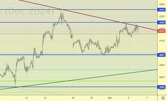 Продолжаем считать, что не исключен откат к 412.0, где желающие могут присоединиться к стадии роста. Но в целом картинка продолжает оставаться унылой. Сильных идей для торговли здесь нет.