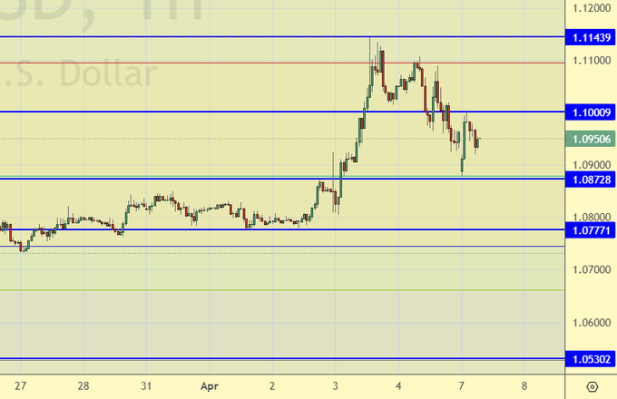 Продажа: нет. Кто в позиции от 1.1093, перенесите стоп на 1.1110. Цель: 1.0550 (пересмотрена).