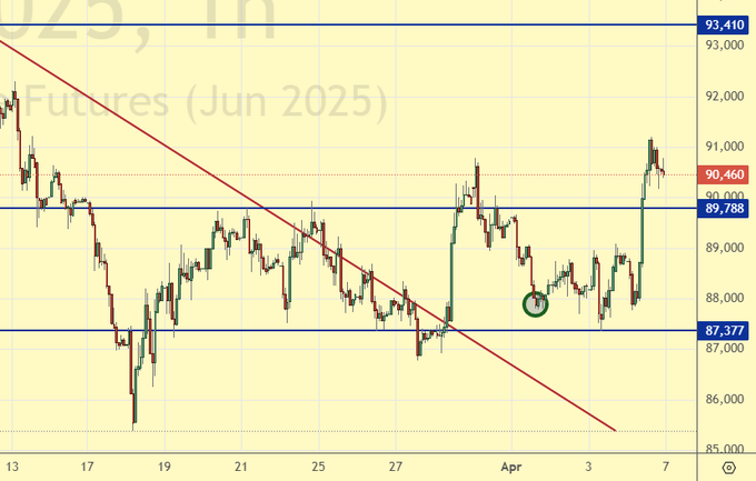 Покупка: нет. Кто в позиции от 86750 и 88000, перенесите стоп на 88000. Цель: 96600 (115000).