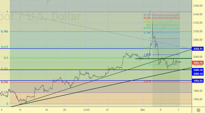 Внесем поправку, сопротивление у нас не на 2040, а на 2035. Продолжаем считать, что текущая формация предполагает падение золота на 1920. Причин для разворота наверх не будет пока не пройдет заседание ФРС 13-го декабря.