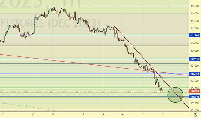 Да, прошли ниже 105000, подлетели к 103000. Будем сегодня эту отметку бороть. Честно говоря, покупать страшно. Поэтому явно рекомендовать лонг не будем. Рубль утром продолжает сдавать, что может привести к провалу на 101000. Но если от 103000 (или от 101000) появятся зеленые свечи на «часовках», и будет ясен локальный минимум (фрактал появится), то можно пробовать войти в лонг.