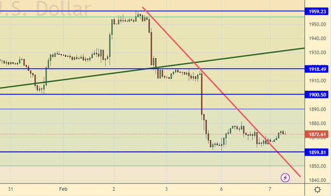 Приостановили падение. Напрашивается, как минимум, еще один удар вниз. Хорошо, если рынок поднимется к 1900, там можно будет зайти в шорт или нарастить позицию. Не исключено, что в ближайшие недели доллар продолжит усиливать позиции, особенно, в случае сохранения перспектив высокой инфляции в США.