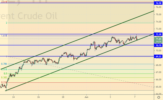 Рынок нефти продолжает оставаться в тонусе. Цены находятся на локальных максимумах. Впрочем, впереди нас ждет осмысление итогов заседания ОПЕК+. Не факт, что мы сразу же отправимся к 76.50. Есть вариант, с пробитием линии поддержки и движением к 69.30.