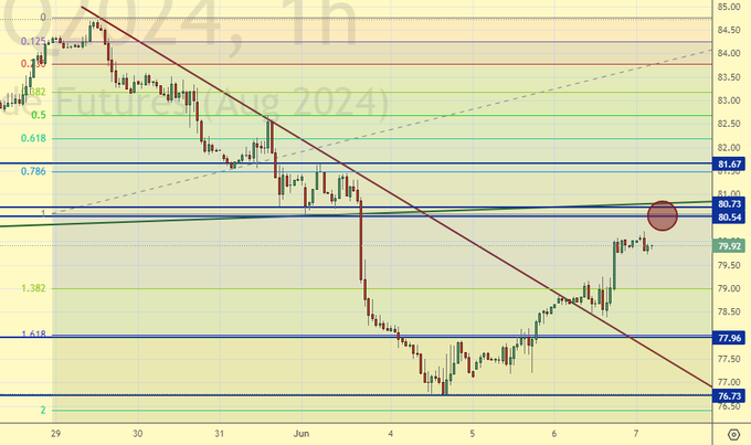 Итак, мы пришли к 80.00. Это не удивительно. Будет ли теперь ход выше данного уровня? Здесь уже сложнее. У ОПЕК+ точно все под контролем? Нельзя исключать, что мир не сможет расти в условиях, когда мы стоим на пороге глобального конфликта. Это откровенно пугает. Спрос на нефть приостановился и не растет, что отражается и в падении закупок Китаем, и в падении цен на топливо в Европе.