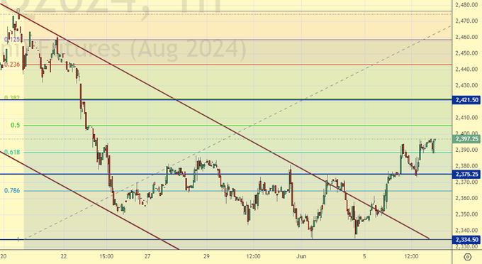 Ничего интересного, кроме продажи от 2420 здесь нет. Если уйдем выше 2460, то придется. Рассуждать о 2650 и 3000. Доллару будет очень плохо? Вряд ли. США всегда выигрывали от конфликта в Европе.