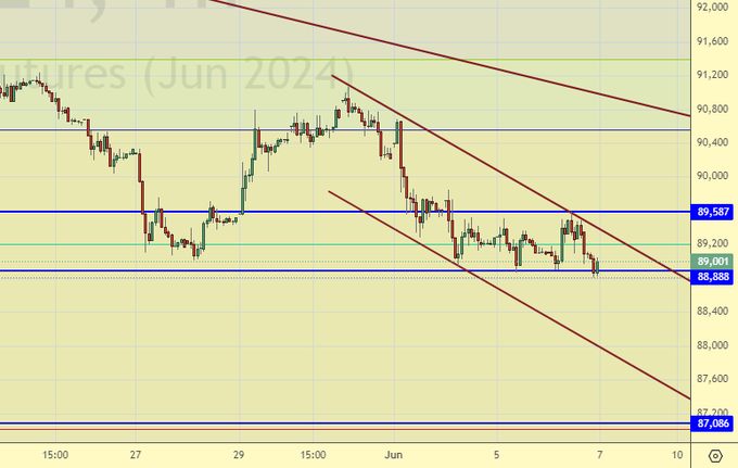 Продажа: нет. Кто в позиции от 90380, перенесите стоп на 89200. Цель: 87000.