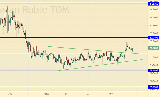 Рубль может окрепнуть сегодня. Нельзя исключать прокола к 60.00. Любое снижение стоит использовать для покупки долларов. Так как уровень расходов на следующий год явно вырастет, а дефицит бюджета при этом рискует разрастись, то укрепление рубля не самое нужное на данные момент действие для Правительства.