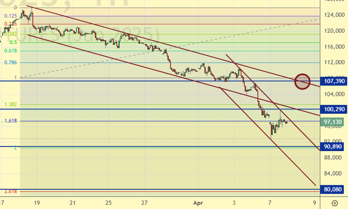 Продажа: при откате к 107000. Стоп: 110000. Цель: 80000. Сейчас (97130). Стоп: 97770. Цель: 80000.