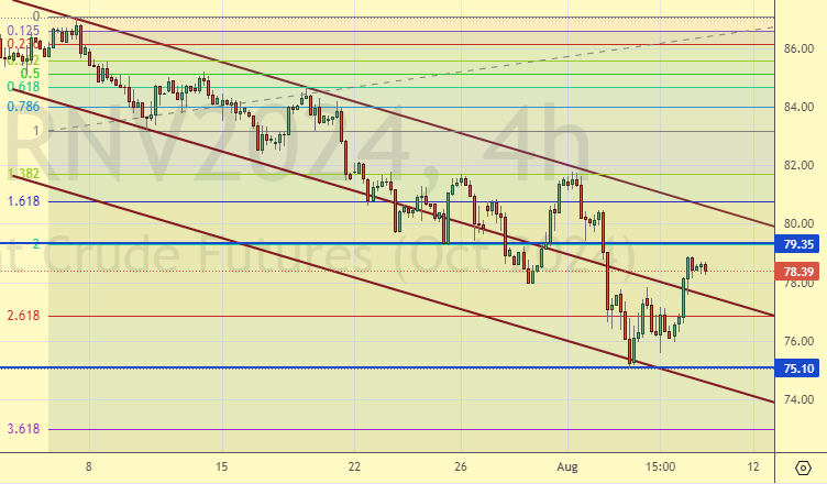Китайские товарищи сократили экспорт нефти в июле до 2-х летнего минимума: 9,97 млн. баррелей в сутки. При этом отмечается слабая рентабельность переработки и низкий спрос на топливо. Эти данные явно говорят в пользу того, что дальше китайская экономика расти не может. Отметим, что даже текущий импорт — это достаточно много для рынка в целом, почти 10% всего что добывается в мире. Если Китай сильно чихнет, то мы быстро будем на 60.00. Но это не перспектива ближайших дней.