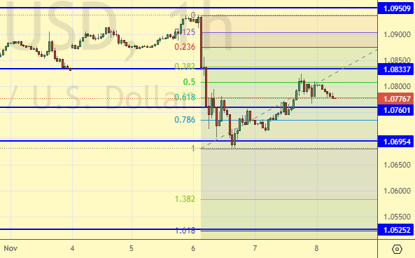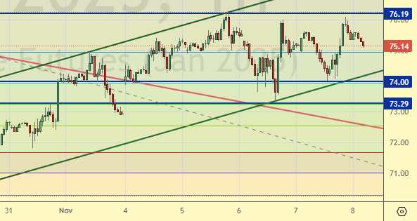 Реакция на снижение ставки ФРС на рынке оказалась крайне сдержанной. ФРС сделала то, что от неё и ждали. Иногда, по факту выхода новости идет движение, как правило в обратную сторону, но его в этот раз не было. Видимо, все выдохлись на этапе выборов президента США и эмоций не осталось. Нефть пока не смогла взять 76.20, что оставляет шансы для продавцов.