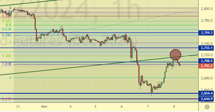 Нельзя отрицать спуска к 2550. Однако, мы пока поставим на то, что политика смягчения ставок продолжится, при этом траты Трампа в следующем году могут быть существенными. Мало ли что тому придет в худую голову. Если так, то золото должно оставаться в тонусе. При этом, краткосрочные шорты не запрещены.