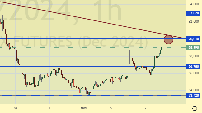 Подходим к рабочей области для продаж. Как и по паре доллар-рубль отмечаем возможность резкой смены настроения после любых реплик от новоизбранного президента США. При этом, отказываться от отработки в шорт района 90000 технически не верно.