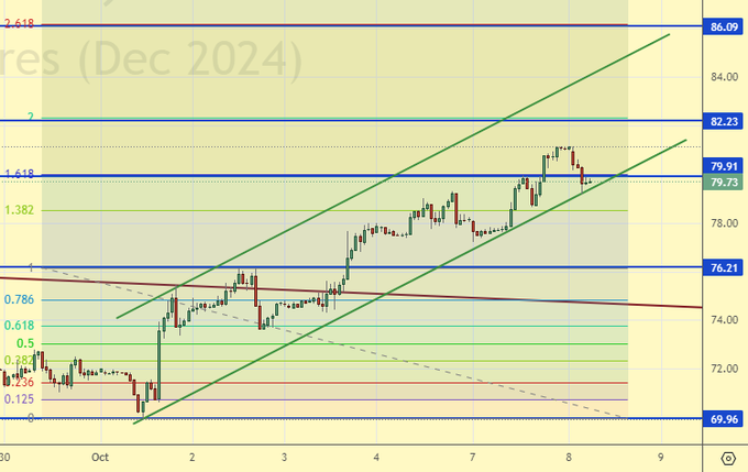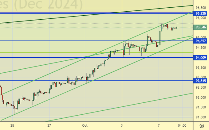 «Имеет смысл постоять и не торопиться с фиксацией прибыли», — писали мы вчера утром. Надо же…, похоже нам светит 96200 и только затем мы, может быть, остановимся на пару дней. Есть ощущение на фоне процентных ставок в банках, которые выше ставки ЦБ, что денег там нет и через пару месяцев, аккурат под новый год нас ждут увлекательные приключения: «а ну-ка забери свой вклад». Это просто гипотеза имени 8 октября, сегодня 8-е октября но все же, почему бы её и не прописать здесь.