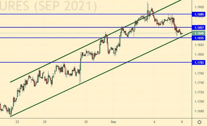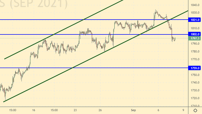 Золото покинуло растущий канал. Цель на 1760 в зоне видимости. Сценариев усиления доллара не так и много. Да, не исключено, что Пауэлл 22-го сентября заявит о том, что мы свернем программу количественного смягчения месяцев через шесть. Но это не повод для укрепления американской валюты прямо сейчас. Среднесрочно рассматриваем падение стоимости золота только как возможность для его покупки. Краткосрочно, продажи золота против доллара не возбраняются.