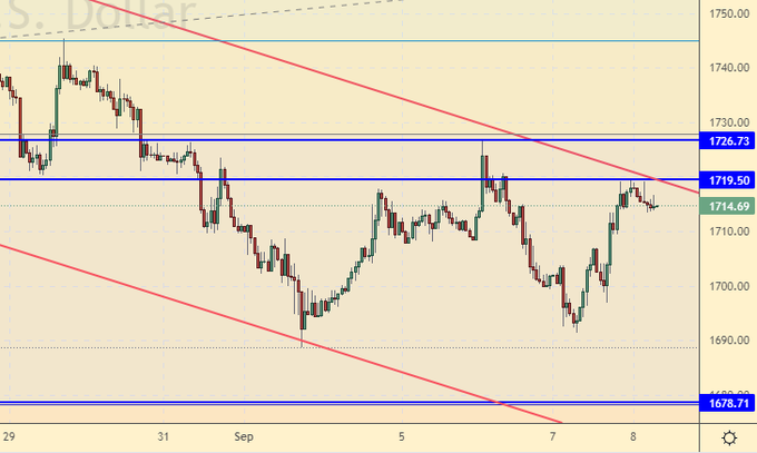 Возвратом к 1720 стоит воспользоваться для открытия или наращивания шортов. Пока мы продолжаем верить в падение золота, однако, сохраняем голову холодной. Если что-то произойдет и котировки поднимутся выше 1750, то мы пересмотрим свой взгляд на рынок.