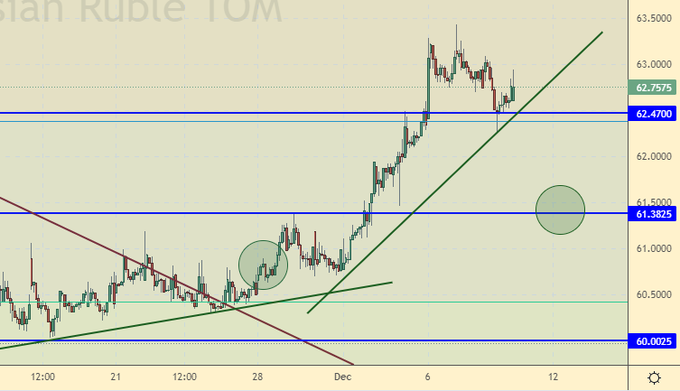 Рубль дежурно отошел вниз от района 63.50, но, как видим, сильным данный откат пока назвать нельзя. Возможно, что рынок придет к 61.40, но пройти ниже будет трудно. Пока имеет смысл держать лонги и докупать на откатах.